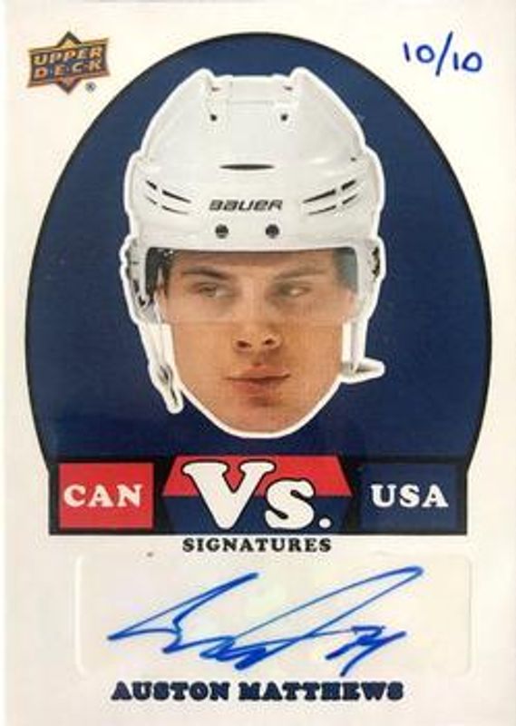 The Auston Matthews 2017 Upper Deck Team Canada #VS-1 Vs. Signatures /10 card is 1 of 3 Auston Matthews' card variations in the 2017 Upper Deck Team Canada set being tracked by Sports Card Investor, including Vs. Black, and Vs. (Versus).