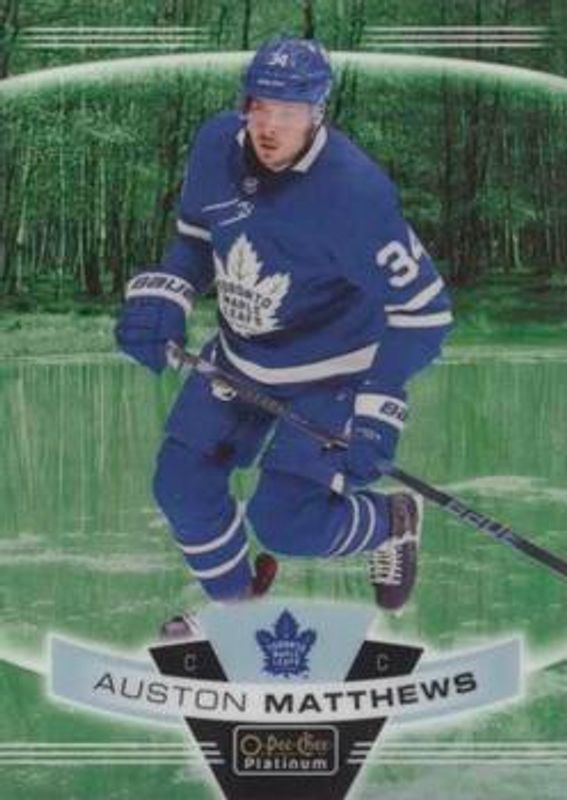 The Auston Matthews 2019 O-Pee-Chee Platinum #10 Pond Hockey Green card is 1 of 41 Auston Matthews' card variations in the 2019 O-Pee-Chee Platinum set being tracked by Sports Card Investor, including #10b Base, #10 Base, #10 Matte Pink, #10 Pond Hockey, and #10 Rainbow.