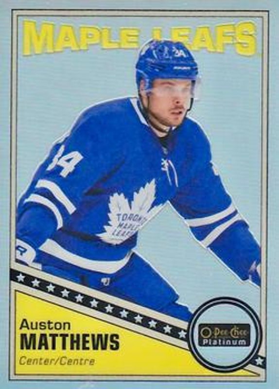 The Auston Matthews 2019 O-Pee-Chee Platinum #R-34 Retro - Rainbow card is 1 of 41 Auston Matthews' card variations in the 2019 O-Pee-Chee Platinum set being tracked by Sports Card Investor, including #10b Base, #10 Base, #10 Matte Pink, #10 Pond Hockey, and #10 Rainbow.