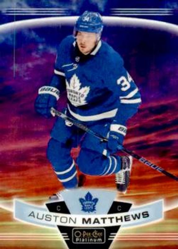 The Auston Matthews 2019 O-Pee-Chee Platinum #10 Sunset card is 1 of 41 Auston Matthews' card variations in the 2019 O-Pee-Chee Platinum set being tracked by Sports Card Investor, including #10b Base, #10 Base, #10 Matte Pink, #10 Pond Hockey, and #10 Rainbow.
