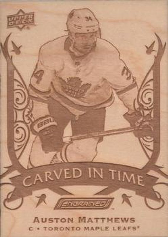 The Auston Matthews 2019 Upper Deck Engrained #CT-7 Carved in Time card is 1 of 13 Auston Matthews' card variations in the 2019 Upper Deck Engrained set being tracked by Sports Card Investor, including Base /299, Ebony /49, Mahogany /10, Rosewood /1, and Carved in Time Signatures.