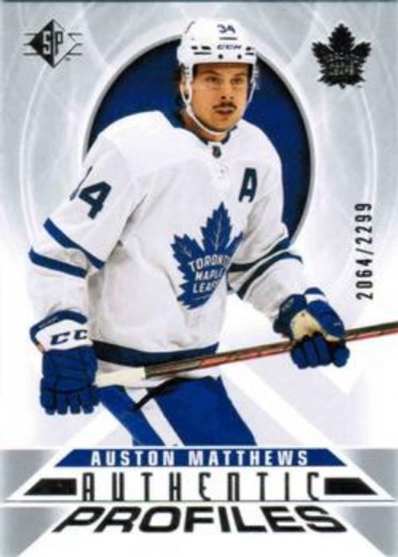 The Auston Matthews 2020 SP #AP-20 Authentic Profiles /2299 card is 1 of 14 Auston Matthews' card variations in the 2020 SP set being tracked by Sports Card Investor, including Base /2299, Blue, Authentic Profiles - Blue, Authentic Profiles Jersey, and Authentic Profiles - Pyrotechnic Gold.