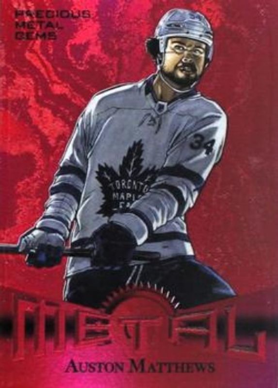 The Auston Matthews 2022 Metal Universe #RT-10 2013 Retro - Precious Metal Gems Red /100 card is 1 of 42 Auston Matthews' card variations in the 2022 Metal Universe set being tracked by Sports Card Investor, including Base, Spectrum FX Blue, Auto Silver FX /349, Spectrum FX Purple /199, and Precious Metal Gems Green /100.