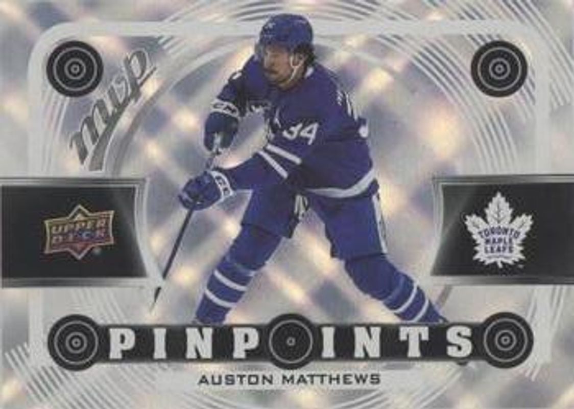 The Auston Matthews 2022 Upper Deck MVP #PP-5 Pinpoints card is 1 of 41 Auston Matthews' card variations in the 2022 Upper Deck MVP set being tracked by Sports Card Investor, including Base, Blue Script, Gold Script, Ice Battles, and Silver Script.