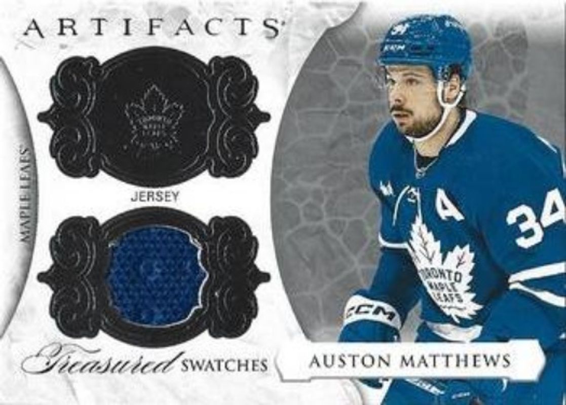 The Auston Matthews 2023 Upper Deck Artifacts #TS-AM Treasured Swatches card is 1 of 44 Auston Matthews' card variations in the 2023 Upper Deck Artifacts set being tracked by Sports Card Investor, including Base /999, Leather, Plexi, Turquoise, and Wood.
