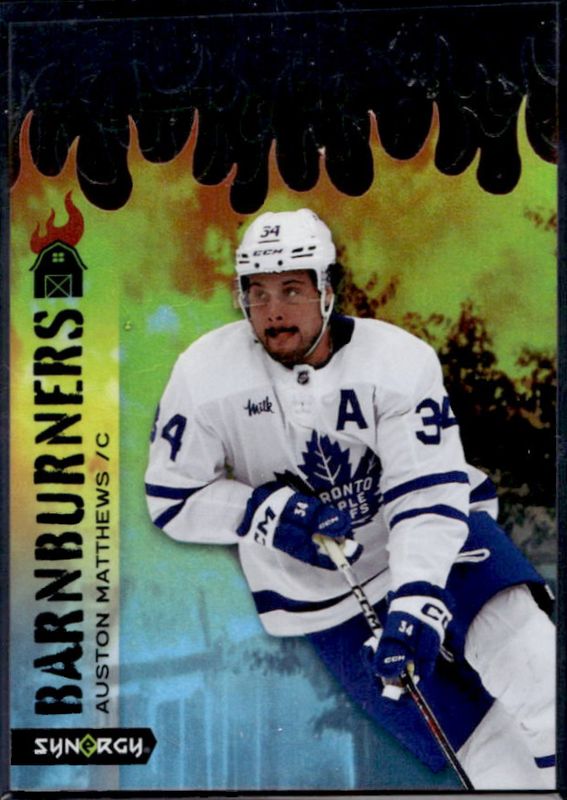 The Auston Matthews 2023 Upper Deck Synergy #BARN-9 Barnburners! card is 1 of 32 Auston Matthews' card variations in the 2023 Upper Deck Synergy set being tracked by Sports Card Investor, including Base /24, Red, Red Codes, Purple /99, and Gold /25.