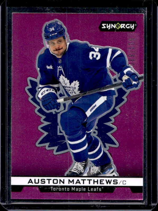 The Auston Matthews 2024 Upper Deck Synergy #IM-7 NHL Impressions Magenta /599 card is 1 of 28 Auston Matthews' card variations in the 2024 Upper Deck Synergy set being tracked by Sports Card Investor, including Base, Red Codes, Purple /49, Gold Bounty /25, and Red /25.