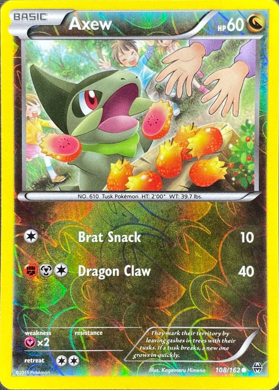 The Axew 2015 XY: BREAKthrough #108/162 Reverse Holo card in Raw TCG (Lightly Played) condition has not changed in price in the last 30 days and was last sold for $1.25 .