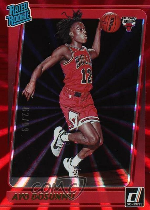 The Ayo Dosunmu 2021 Donruss #221 Red Laser /99 Rookie card in Raw condition has not changed in price in the last 30 days and was last sold for $55.00 .