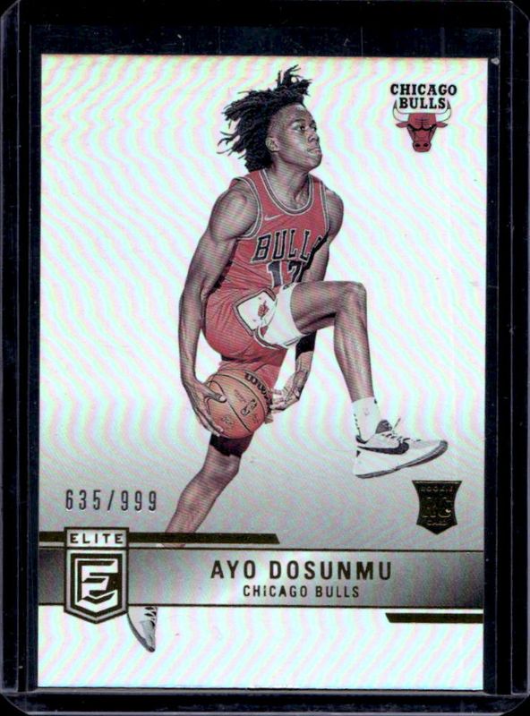 The Ayo Dosunmu 2021 Elite #249 Base Rookie card is 1 of 27 Ayo Dosunmu's card variations in the 2021 Elite set being tracked by Sports Card Investor, including Base Rookie /999, Asia Exclusive, Asia Hyper Gold, Asia Hyper Red, and Aspirations (/88).
