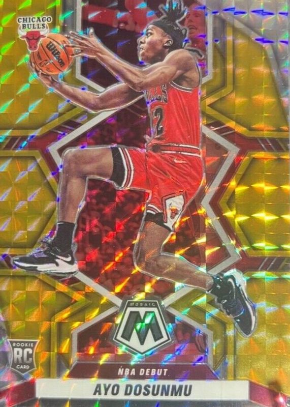 The Ayo Dosunmu 2021 Mosaic #279 NBA Debut - Gold /10 Rookie card in Raw condition has not changed in price in the last 30 days and was last sold for $50.00 .