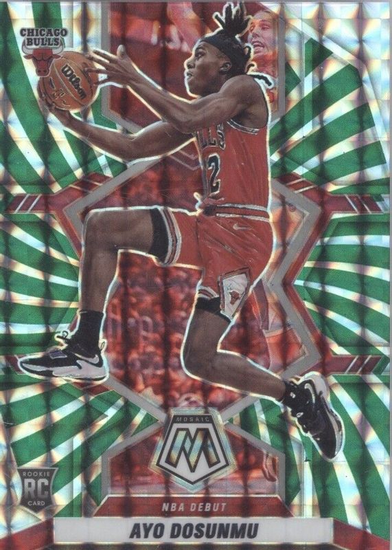 The Ayo Dosunmu 2021 Mosaic #279 NBA Debut - Green Swirl /10 Rookie card in Raw condition has not changed in price in the last 30 days and was last sold for $50.00 .