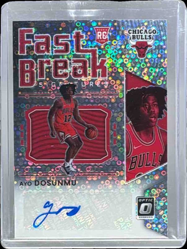 The Ayo Dosunmu 2021 Optic #FB-ADM Fast Break Signatures Rookie card is 1 of 81 Ayo Dosunmu's card variations in the 2021 Optic set being tracked by Sports Card Investor, including Base, Blue Pulsar, Blue Velocity, Checkerboard, and Choice.