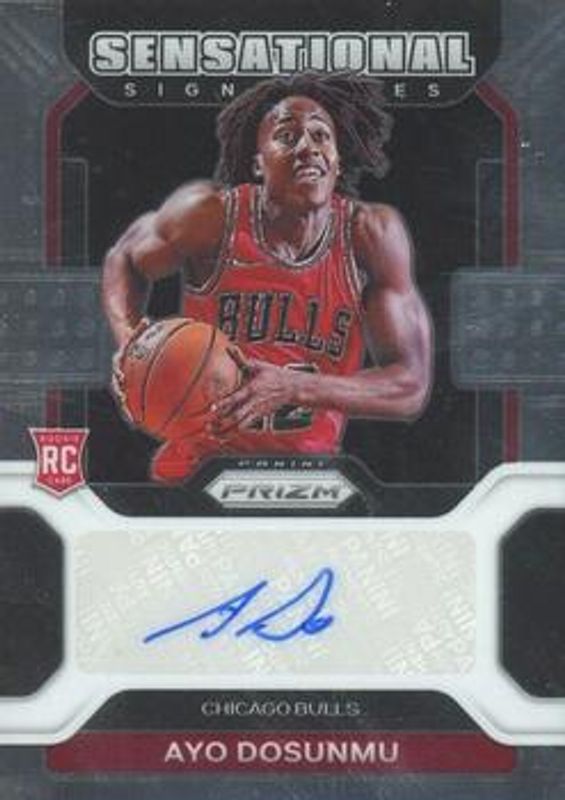 The Ayo Dosunmu 2021 Prizm #SS-AYO Sensational Signatures Rookie card is 1 of 84 Ayo Dosunmu's card variations in the 2021 Prizm set being tracked by Sports Card Investor, including Base, Blue NBA 75th Anniversary, Blue Wave, Choice Blue Yellow Green, and Factory Set Blue Hyper.