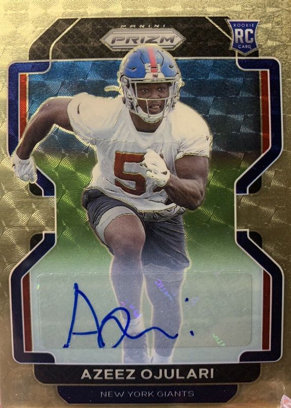 The Azeez Ojulari 2021 Prizm #386 Rookie Autographs - Gold Vinyl /5 card in Raw condition has not changed in price in the last 30 days and was last sold for $184.99 .