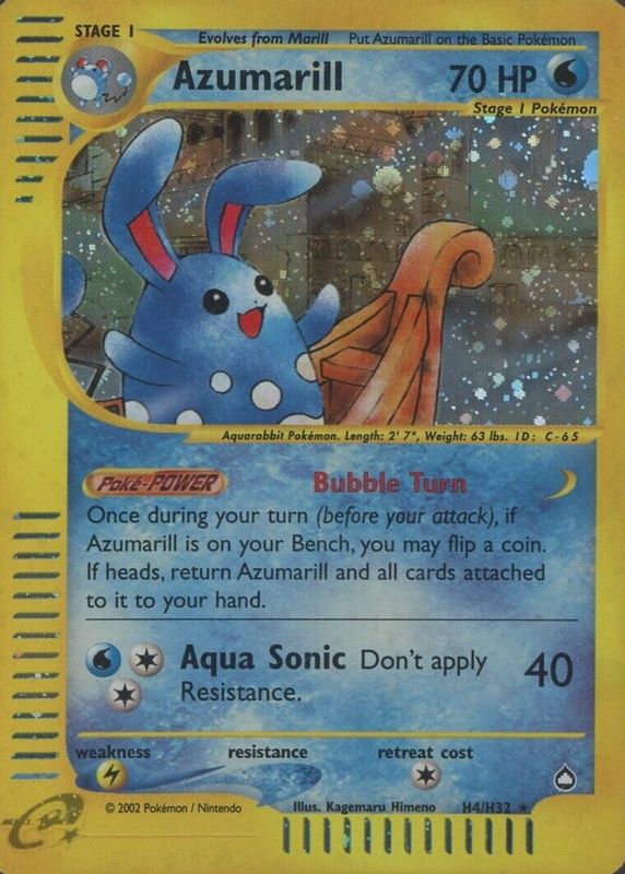 The Azumarill 2003 Aquapolis #H4 Holo card in Raw TCG (Heavily Played) condition has not changed in price in the last 30 days and was last sold for $5.00 .