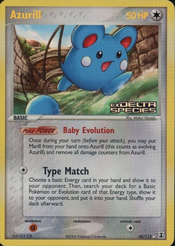 The Azurill 2005 EX: Delta Species #020/113 Reverse Holo card in Raw TCG (Near Mint) condition has not changed in price in the last 30 days and was last sold for $20.00 .