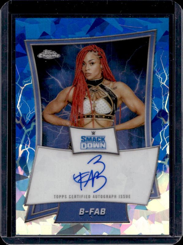The B-Fab 2025 Topps Chrome WWE Sapphire Edition #BBA-FAB Blue Brand Autographs card is 1 of 11 B-Fab's card variations in the 2025 Topps Chrome WWE Sapphire Edition set being tracked by Sports Card Investor, including Base Chrome, Base Chrome - Green Refractor /75, Base Chrome - Gold Refractor /50, Base Chrome - Orange Refractor /25, and Blue Brand Autographs - Orange Refractor /25.