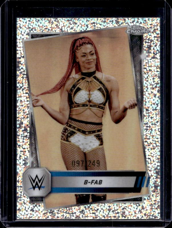 The B-Fab 2025 Topps Chrome WWE #67 Speckle Refractor /249 card is 1 of 25 B-Fab's card variations in the 2025 Topps Chrome WWE set being tracked by Sports Card Investor, including Base, Neon Green & Black Refractor, Pink Shimmer Refractor, Prism Refractor, and Purple Refractor.