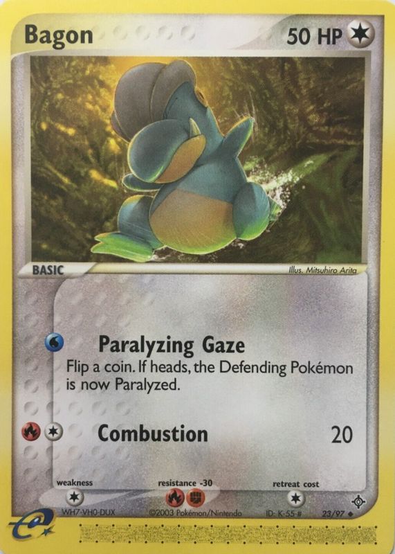 The Bagon 2003 EX: Dragon #23/97 Base card in Raw TCG (Near Mint) condition has not changed in price in the last 30 days and was last sold for $2.89 .