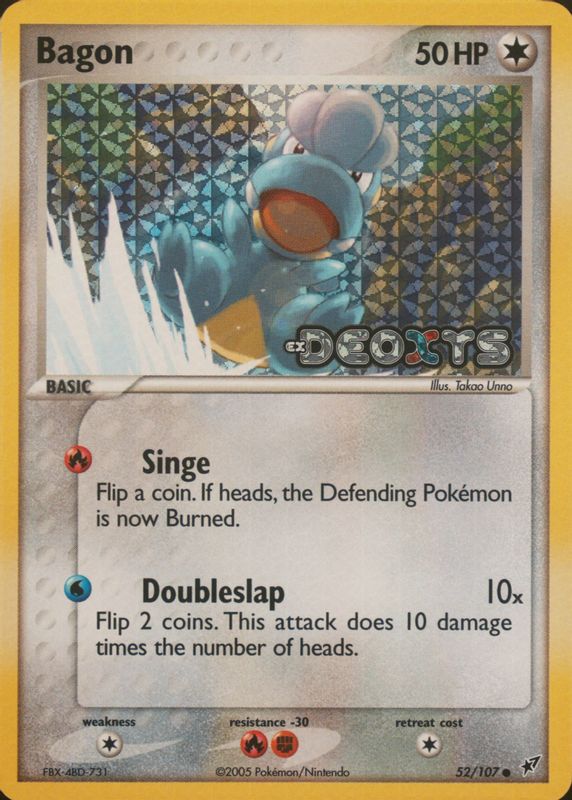 The Bagon 2005 EX: Deoxys #052/107 Reverse Holo card in Raw TCG (Near Mint) condition has not changed in price in the last 30 days and was last sold for $19.99 .