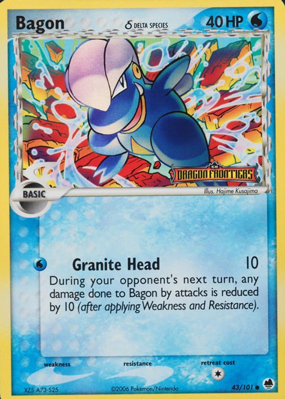 The Bagon 2006 EX: Dragon Frontiers #043/101 Reverse Holo card in Raw TCG (Near Mint) condition has moved up $4.70 (+22.3%) in the last 30 days and was last sold for $25.79 .