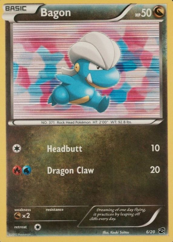The Bagon 2012 Black & White: Dragon Vault #06/20 Holo card in Raw TCG (Near Mint) condition has moved up $5.67 (+284%) in the last 30 days and was last sold for $7.67 .