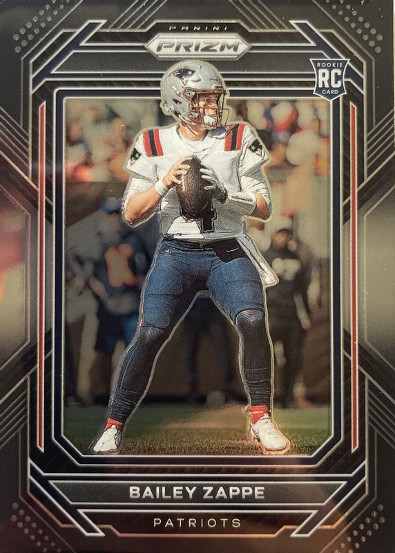 This card is 1 of 26 Bailey Zappe's card variations in the 2022 Chronicles set being tracked by Sports Card Investor, including Prizm Black, Score Premium Update, Prizm Black - Red /99, Prizm Black - Orange /75, and Prizm Black - Green /49.