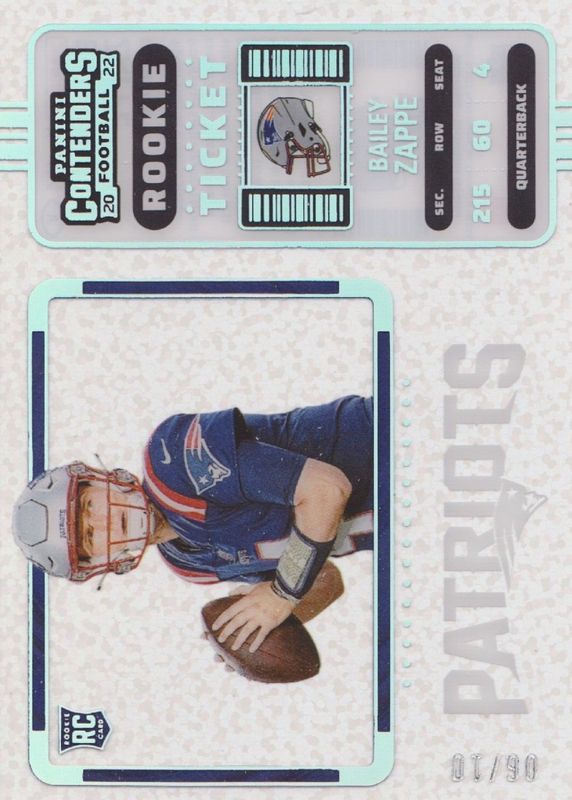 This card is 1 of 28 Bailey Zappe's card variations in the 2022 Contenders set being tracked by Sports Card Investor, including Rookie Ticket Auto, Rookie Ticket Auto - Red Zone Ticket, Rookie Ticket Auto - Silver (/99), Rookie Ticket Auto - Ticket Stub (/4), and Rookie Ticket Auto - Wild Card.