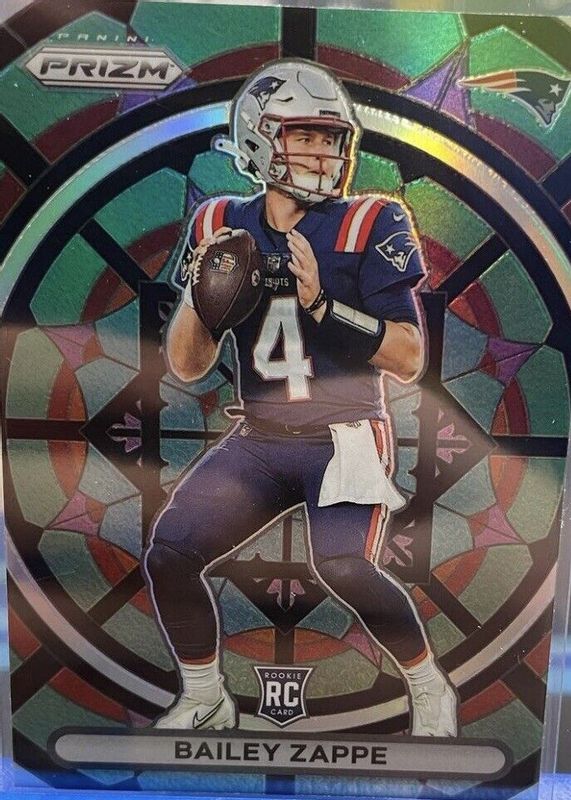 The Bailey Zappe 2022 Prizm #SG-4 Stained Glass /(SSP) Rookie card in Raw condition has not changed in price in the last 30 days and was last sold for $20.50 .