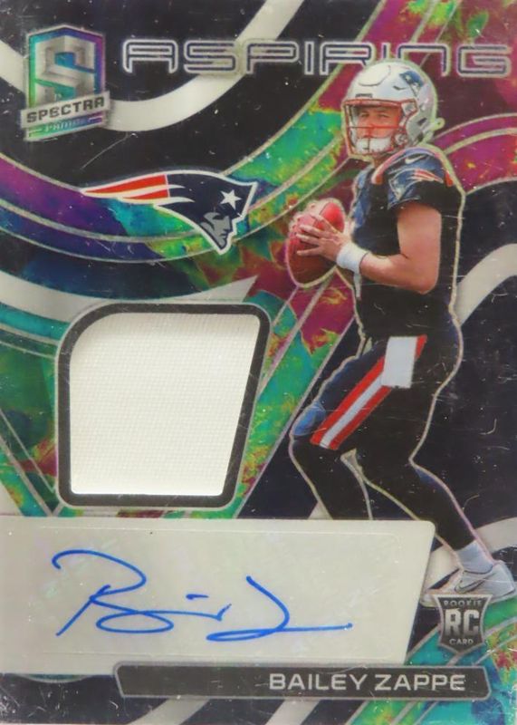 This card is 1 of 39 Bailey Zappe's card variations in the 2022 Spectra set being tracked by Sports Card Investor, including Base, Rookie Patch Auto /125, Aspiring Patch Autographs /99, Rookie Patch Auto - Celestial /99, and Rookie Patch Auto - Hyper /75.