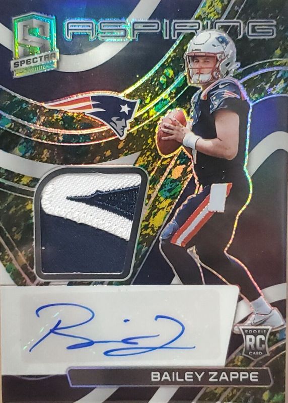 Auctions Ending Soon for Bailey Zappe 2022 Spectra #APA-BZA Aspiring Patch Autographs - Neon Splatter /8 Rookie RAW