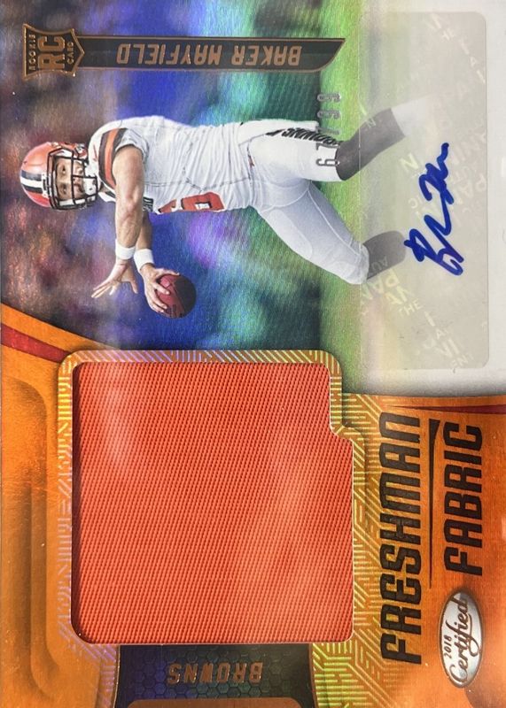 The Baker Mayfield 2018 Certified #206 Freshman Fabric Signatures - Mirror Orange (/99) Rookie card in Raw condition has not changed in price in the last 30 days and was last sold for $160.50 .