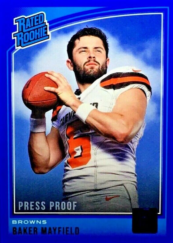 The Baker Mayfield 2018 Donruss #303 Press Proof Blue Rookie card in Raw condition has moved down -$0.50 (-3.8%) in the last 30 days and was last sold for $12.50 .