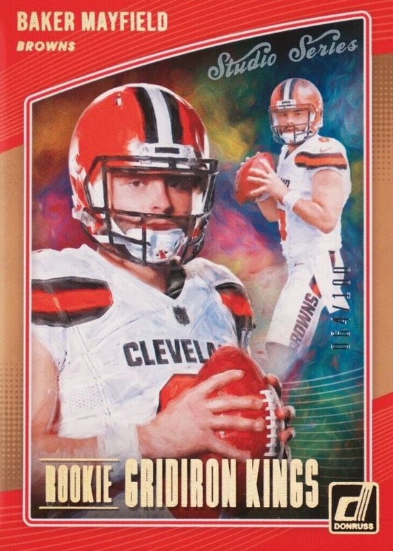 The Baker Mayfield 2018 Donruss #RGK-3 Rookie Gridiron Kings - Studio Series /100 card in Raw condition has not changed in price in the last 30 days and was last sold for $35.00 .
