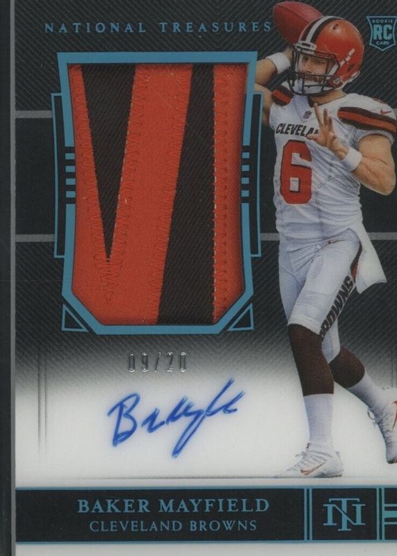 The Baker Mayfield 2018 National Treasures #161 Rookie Patch Auto - Midnight /20 card in Raw condition has not changed in price in the last 30 days and was last sold for $1,370.00 .