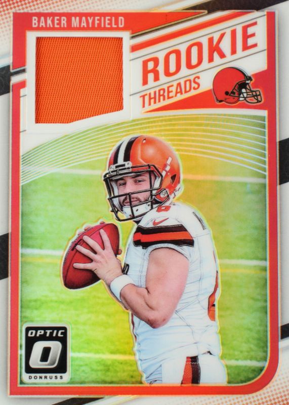 The Baker Mayfield 2018 Optic #RT-BM Rookie Threads - Prime /50 card in Raw condition has not changed in price in the last 30 days and was last sold for $10.95 .