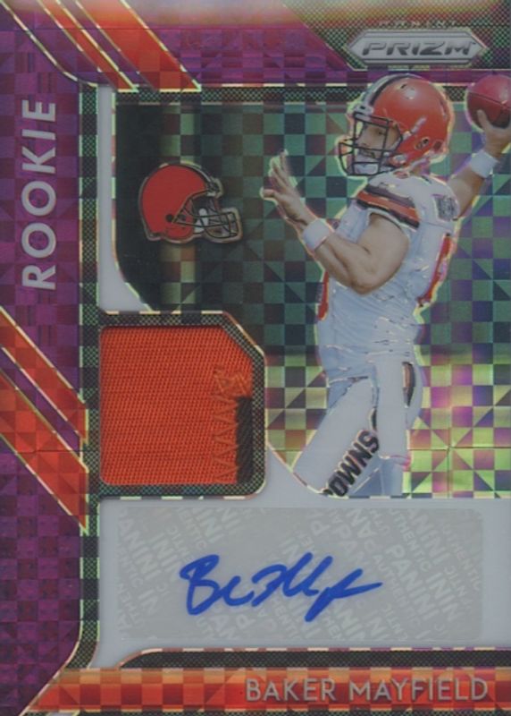The Baker Mayfield 2018 Prizm #RPA-BM Rookie Patch Auto - Purple Power /50 card in Raw condition has not changed in price in the last 30 days and was last sold for $137.50 .