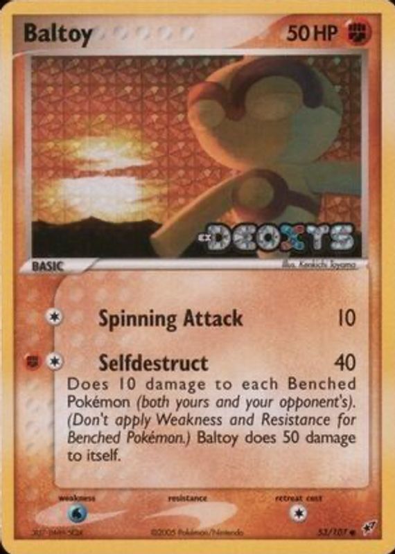 The Baltoy 2005 EX: Deoxys #053/107 Reverse Holo card in Raw TCG (Near Mint) condition has moved down -$0.04 (-0.4%) in the last 30 days and was last sold for $9.95 .