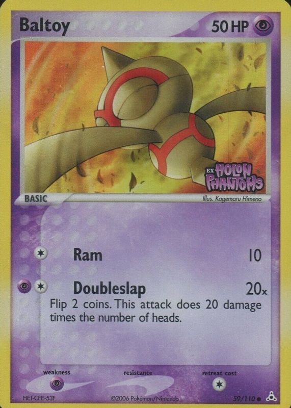 The Baltoy 2006 EX: Holon Phantoms #059/110 Reverse Holo card in Raw TCG (Near Mint) condition has not changed in price in the last 30 days and was last sold for $14.95 .