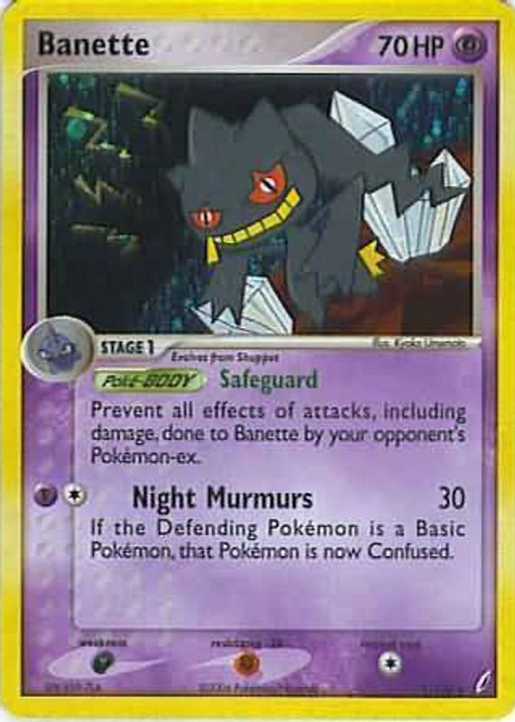 The Banette 2006 EX: Crystal Guardians #001/100 Holo card in Raw TCG (Near Mint) condition has moved down -$4.11 (-31.6%) in the last 30 days and was last sold for $8.89 .