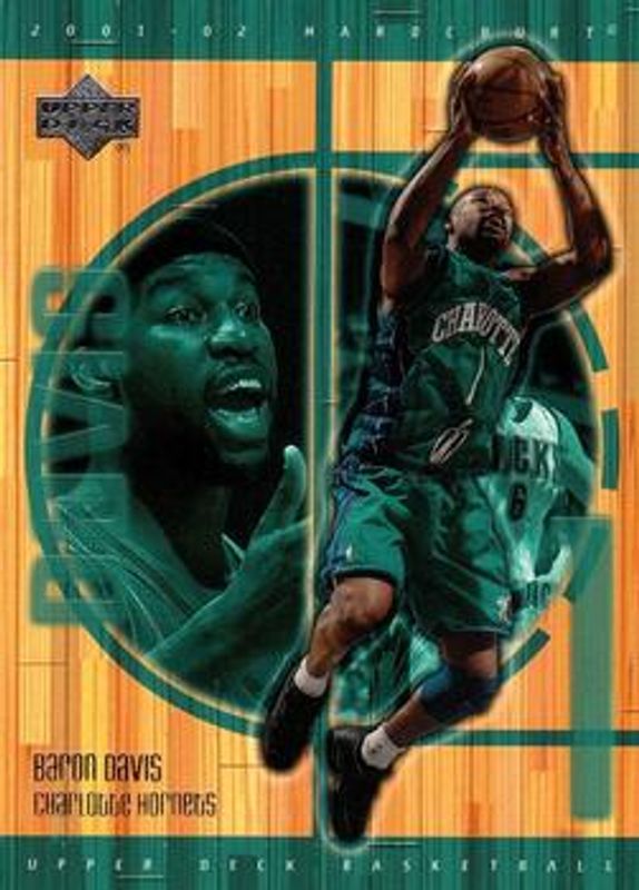The Baron Davis 2001 Upper Deck Hardcourt #8 Base card is 1 of 4 Baron Davis' card variations in the 2001 Upper Deck Hardcourt set being tracked by Sports Card Investor, including Exclusives /25, UD Game Film Floor, and UD Game Floor.