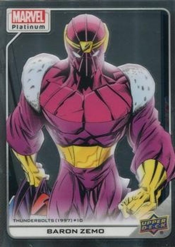 The Baron Zemo 2023 Upper Deck Marvel Platinum #154 Base card is 1 of 30 Baron Zemo's card variations in the 2023 Upper Deck Marvel Platinum set being tracked by Sports Card Investor, including Black Rainbow, Blue Rainbow, Blue Surge, Purple Rainbow, and Rainbow.