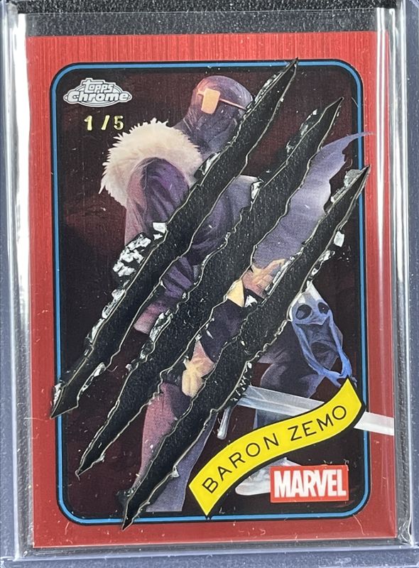 The Baron Zemo 2025 Topps Chrome #125 Clawed Chrome Red Refractor /5 card is 1 of 23 Baron Zemo's card variations in the 2025 Topps Chrome set being tracked by Sports Card Investor, including Base, Refractor, Yellow Lava Refractor, Spider Web Refractor /399, and Blue Refractor /299.