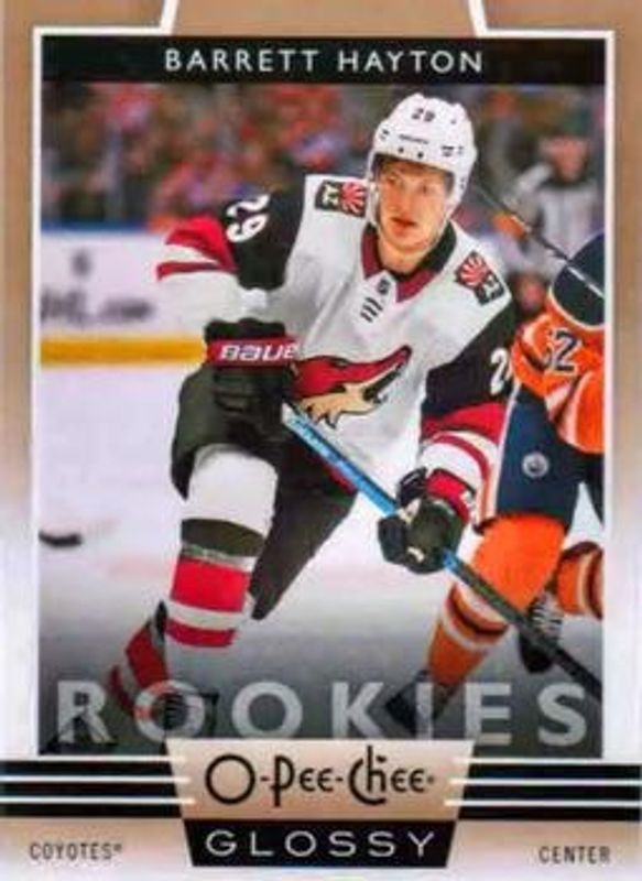 Barrett Hayton's Hockey cards are available in at least 37 sets. Barrett Hayton's biggest 7-day price movers are 2019 Upper Deck #R-17 2019 O-Pee-Chee Glossy Rookies - Copper, 2019 Upper Deck #627 2019 O-Pee-Chee Update Blue Border, and 2019 Upper Deck #F-25 Fluorescence Magenta /5.