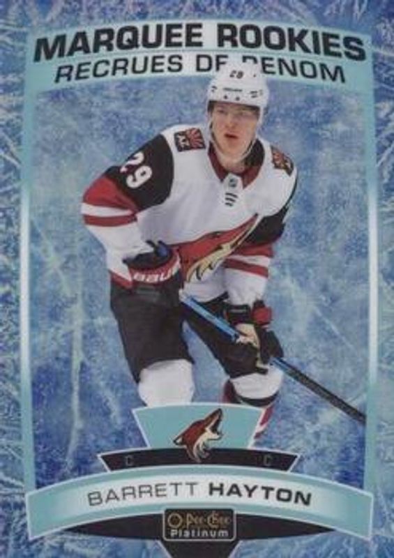 The Barrett Hayton 2019 O-Pee-Chee Platinum #181 Arctic Freeze /99 Rookie card is 1 of 21 Barrett Hayton's card variations in the 2019 O-Pee-Chee Platinum set being tracked by Sports Card Investor, including Base, Matte Pink, Rainbow, Sunset, and Violet Pixels /399.