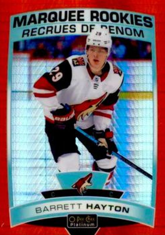 The Barrett Hayton 2019 O-Pee-Chee Platinum #181 Red Prism /199 Rookie card is 1 of 21 Barrett Hayton's card variations in the 2019 O-Pee-Chee Platinum set being tracked by Sports Card Investor, including Base, Matte Pink, Rainbow, Sunset, and Violet Pixels /399.