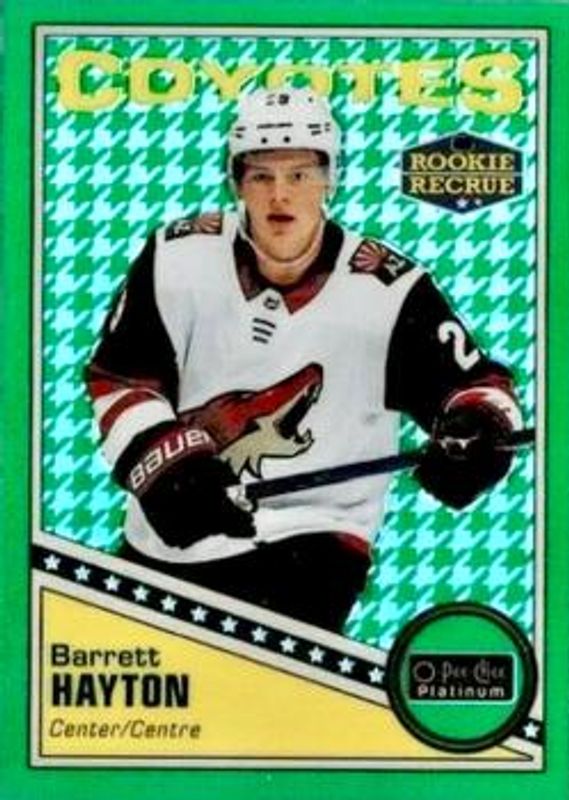 The Barrett Hayton 2019 O-Pee-Chee Platinum #R-65 Retro Green Houndstooth /15 Rookie card is 1 of 21 Barrett Hayton's card variations in the 2019 O-Pee-Chee Platinum set being tracked by Sports Card Investor, including Base, Matte Pink, Rainbow, Sunset, and Violet Pixels /399.