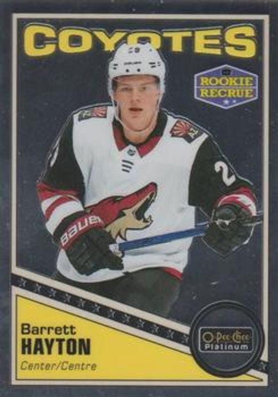 The Barrett Hayton 2019 O-Pee-Chee Platinum #R-65 Retro Rookie card is 1 of 21 Barrett Hayton's card variations in the 2019 O-Pee-Chee Platinum set being tracked by Sports Card Investor, including Base, Matte Pink, Rainbow, Sunset, and Violet Pixels /399.