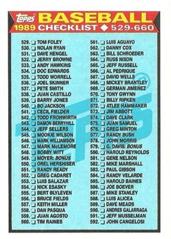 Other popular players in the 1989 Topps set include Checklist, Gary Sheffield, Orel Hershiser, Andre Dawson, and Danny Jackson.